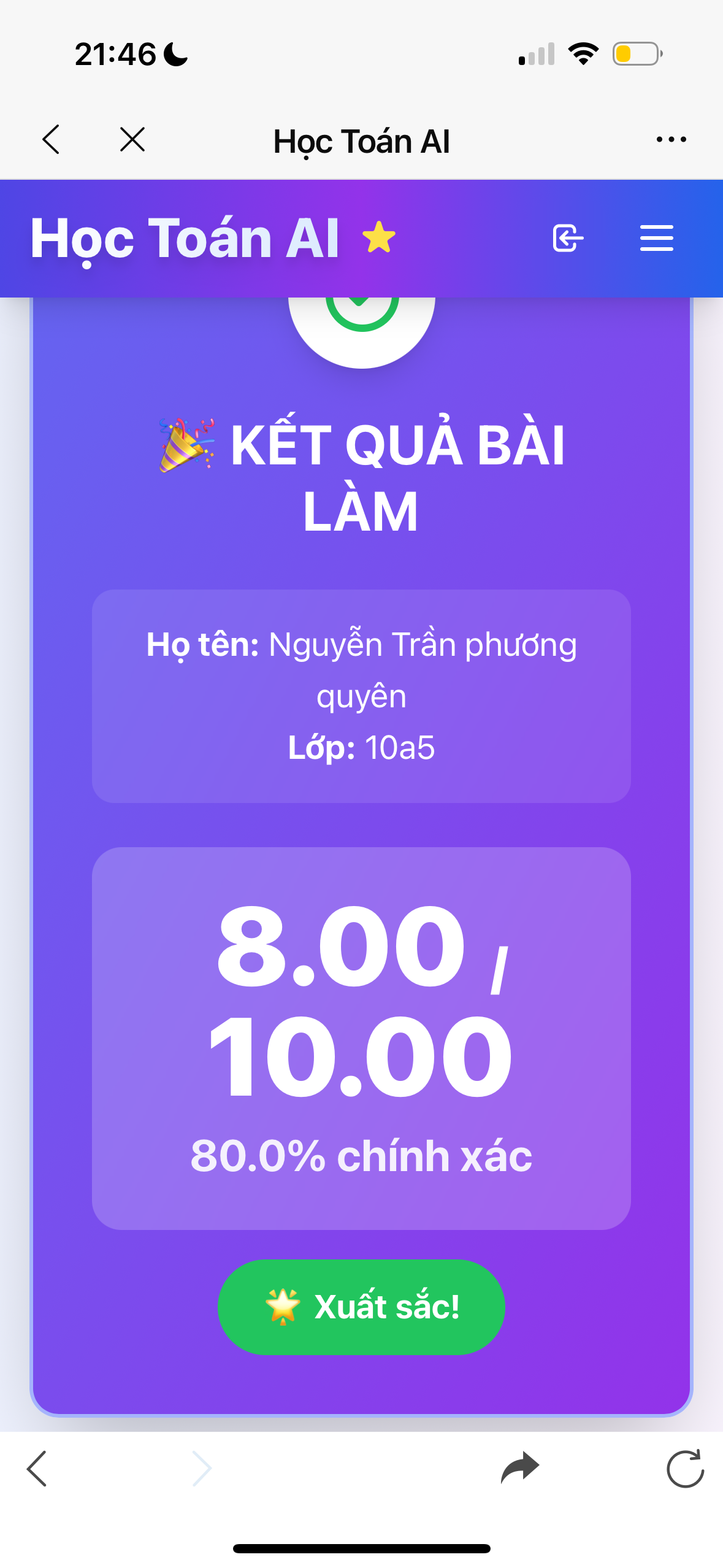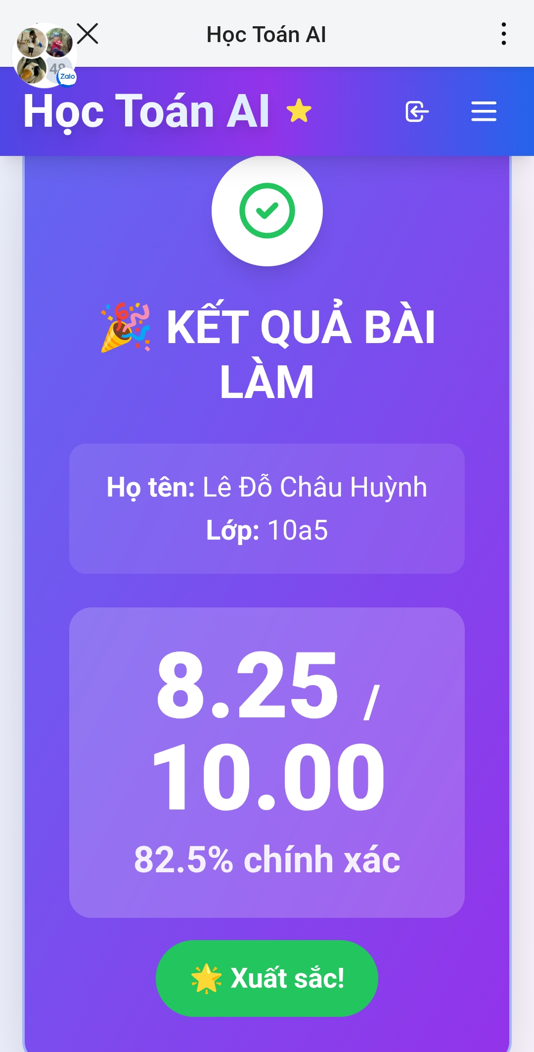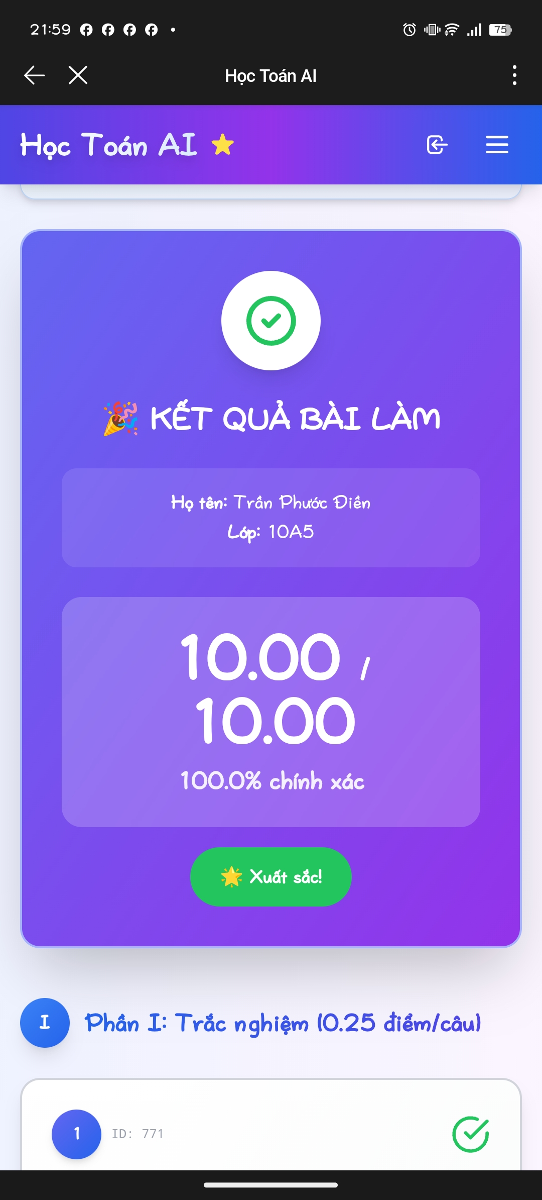 Kết quả Kiểm tra online toán 10