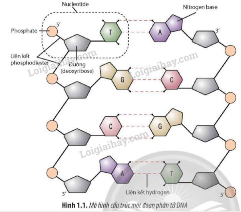 a) Mỗi nucleotide được cấu tạo từ một trong bốn loại nucleobase chứa nitơ hoặc là cytosine (C, ở Việt Nam còn viết là cytosine, viết tắt C), guanine (G), adenine (A), hay thymine (T) liên kết với đường deoxyribose và một nhóm phosphat. Bốn nucleotide khác nhau ở nucleobase.