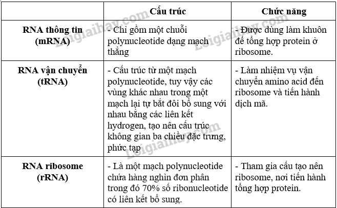 Câu hỏi 6 trang 8 Sinh học 12 : Quan sát hình 1.5, 1.6 và 1.7, đọc đoạn thông tin, lập bằng phân biệt ba loại RNA theo hai tiêu chí: cấu trúc và chức năng