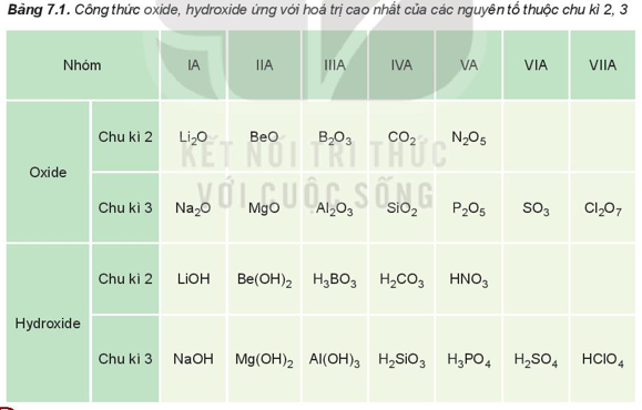 Hóa trị cao nhất của các nguyên tố nhóm A trong hợp chất với oxygen tăng từ I đến VII khi đi từ trái qua phải trong một chu kì (trừ chu kì 1 và nguyên tố fluorine ở chu kì 2), do đó thành phần của các oxide và hydroxide có sự lặp lại theo chu kì.