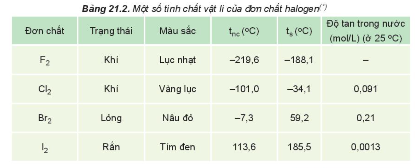 Ở điều kiện thường, đơn chất halogen tồn tại ở dạng phân tử hai nguyên tử, được kí hiệu chung là X2, liên kết hóa học trong phân tử X2 là liên kết cộng hóa trị không phân cực.