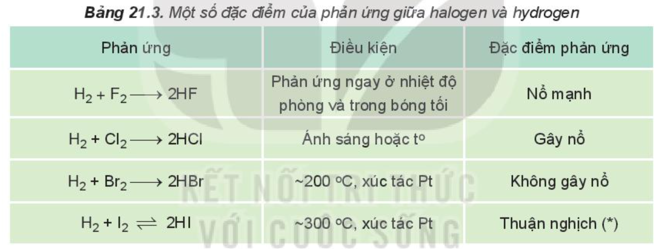 Nhận xét: Mức độ phản ứng của các halogen với hydrogen giảm dần khi đi từ fluorine đến iodine, phù hợp với tính oxi hóa của các halogen giảm dần từ F2 đến I2.