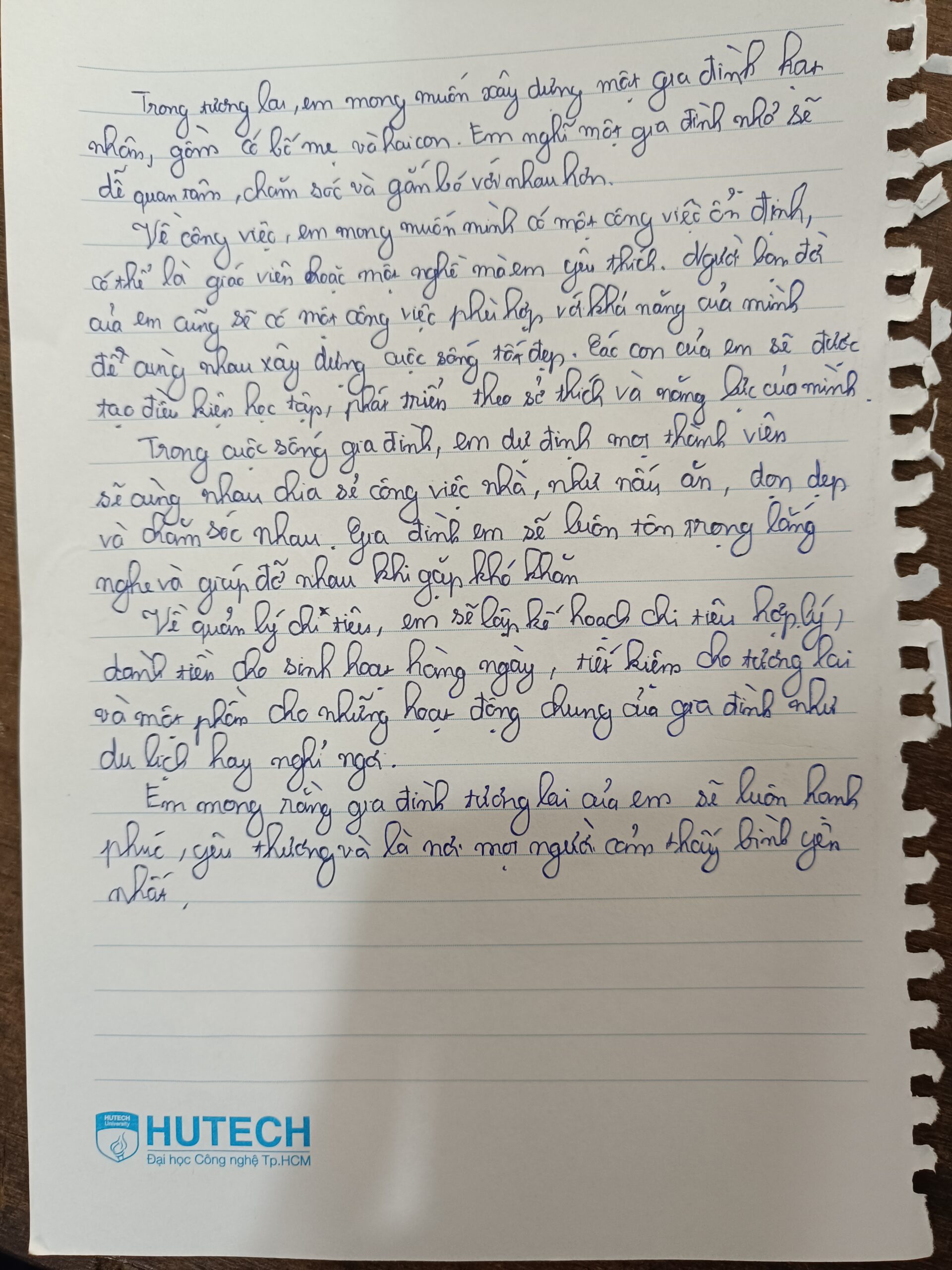 Cuộc sống hằng ngày sẽ được em tổ chức một cách khoa học, cân bằng giữa trách nhiệm gia đình, công việc và thời gian nghỉ ngơi để nâng cao chất lượng cuộc sống. Về quản lý chi tiêu, em sẽ lập kế hoạch tài chính rõ ràng, ưu tiên tiết kiệm và sử dụng tiền bạc hợp lý để hướng tới sự ổn định và an toàn trong tương lai. Em tin rằng một gia đình hạnh phúc không nhất thiết phải đầy đủ về số lượng thành viên mà quan trọng là sự yêu thương, tôn trọng và thấu hiểu lẫn nhau.