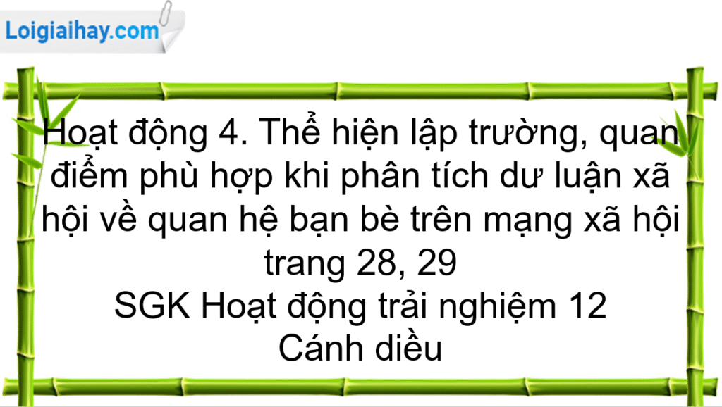 Lựa chọn câu để xem lời giải nhanh hơn CH 1 Trả lời câu hỏi 1 trang 28 SGK HĐTN 12 Cánh diều Đóng vai xử lí các tình huống sau. Tình huống 1: Hẳng kết thân với một số bạn trên mạng vì có chung đam mê, sở thích. Tuy nhiên, trong số các […]