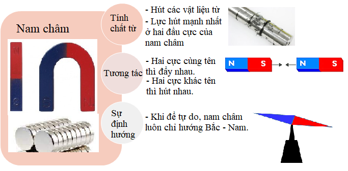 – Nam châm là các vật có khả năng hút các vật bằng sắt và một số vật liệu khác có từ tính. Khi cân bằng nam châm luôn chỉ một hướng xác định, một đầu chỉ hướng Bắc, đầu còn lại chỉ hướng Nam. Các thủy thủ thường dùng nam châm để định hướng trên biển.