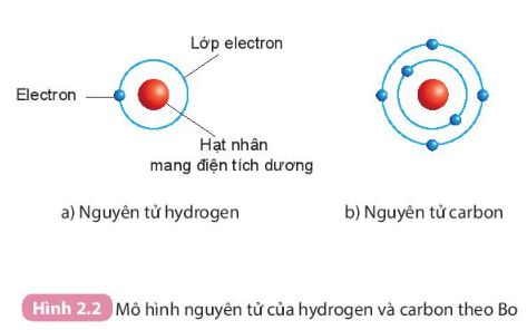 Câu hỏi 2 trang 16 KHTN lớp 7: Quan sát Hình 2.2, áp dụng mô hình nguyên tử của Bo, mô tả cấu tạo của nguyên tử hydrogen và nguyên tử carbon