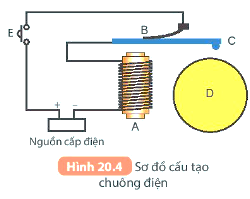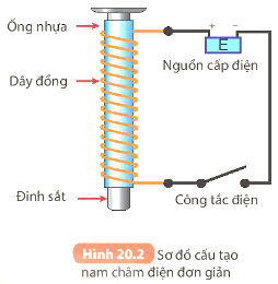 Dùng một đoạn dây đồng quấn xung quanh một ống nhựa, luồn vào trong ống một chiếc đinh sắt dài, nối hai đầu dây với nguồn điện (pin) qua một công tắc điện như Hình 20.2.