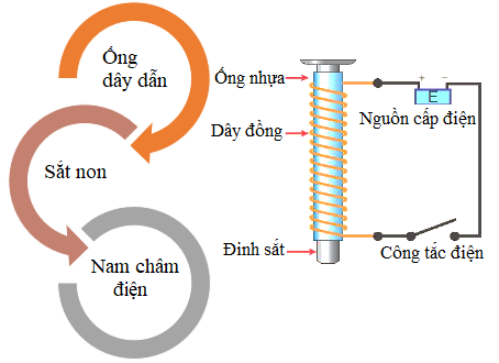 Dùng một đoạn dây đồng quấn xung quanh một ống nhựa, luồn vào trong ống một chiếc đinh sắt dài, nối hai đầu dây với nguồn điện (pin) qua một công tắc điện như hình dưới.