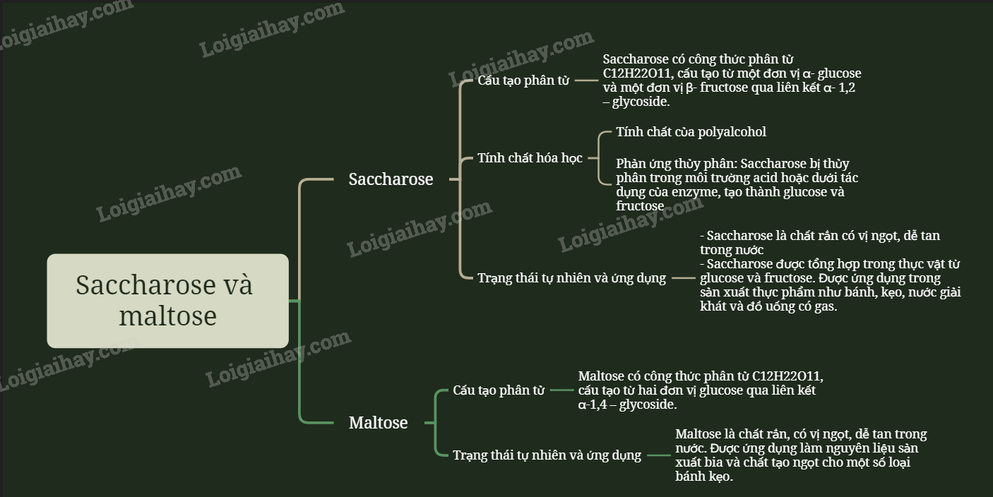 – Saccharose và maltose đều là các disaccharose có công thức phân tử C12H22O11. Phân tử saccharose được tạo bởi một đơn vị – glucose và một đơn vị – fructose, liên kết với nhau qua nguyên tử oxygen giữa C1 của đơn vị – glucose và C2 của đơn vị – frutose: