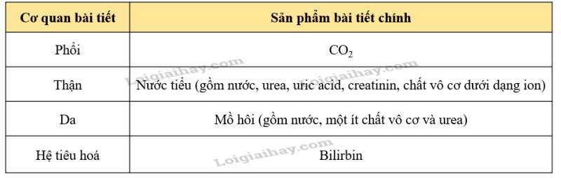 Câu hỏi 1 trang 82 Sinh học 11: Kể tên một số chất bài tiết. Các chất đó được cơ quan nào bài tiết?
