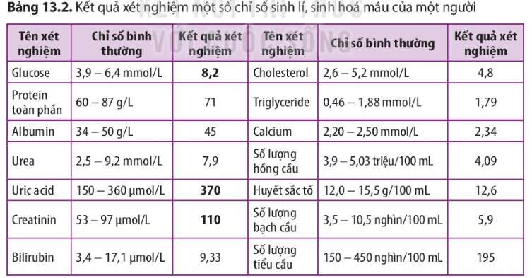 Bảng 13.2 cho thấy kết quả xét nghiệm có nồng độ glucose, uric acid và creatinin cao hơn mức bình thường. Nên chỉ số sinh lí, sinh hoá máu của người này không bình thường, bị mất cân bằng nội môi.