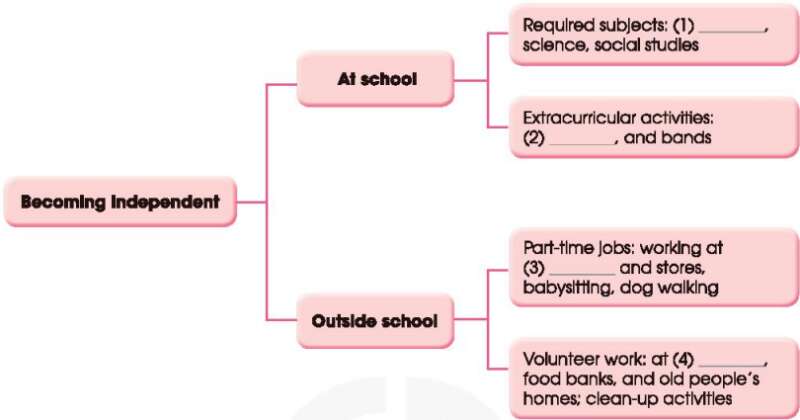 (Làm việc theo nhóm. Chọn một kỹ năng sống mà thanh thiếu niên cần phát triển để trở nên độc lập. Thảo luận về những gì họ cần làm và lập danh sách tất cả các bước và hoạt động.)