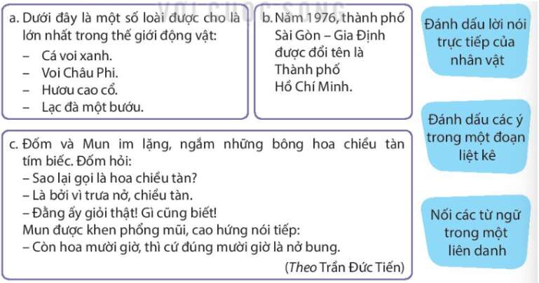Tiếng Việt lớp 4 Tập 1 trang 119 Câu 1: Xác định công dụng của dấu gạch ngang được sử dụng trong mỗi đoạn dưới đây: