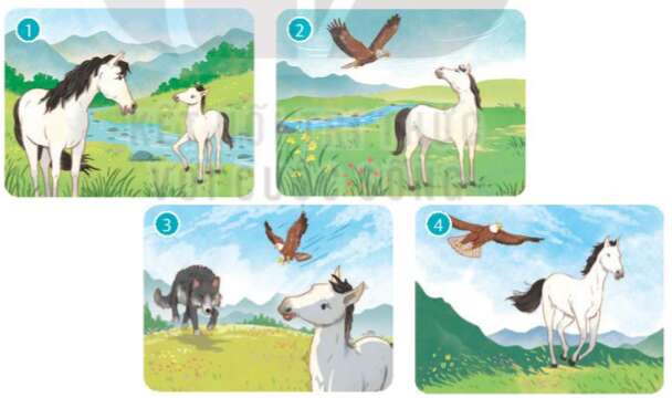 Tranh 3 – Ngựa Trắng xin phép mẹ được đi xa cùng Đại Bàng. Sói Xám ngáng đường, đe dọa Ngựa Trắng. Đại Bàng núi từ trên cao lao xuống, bổ mạnh vào trán Sói, cứu Ngựa Trắng thoát nạn.