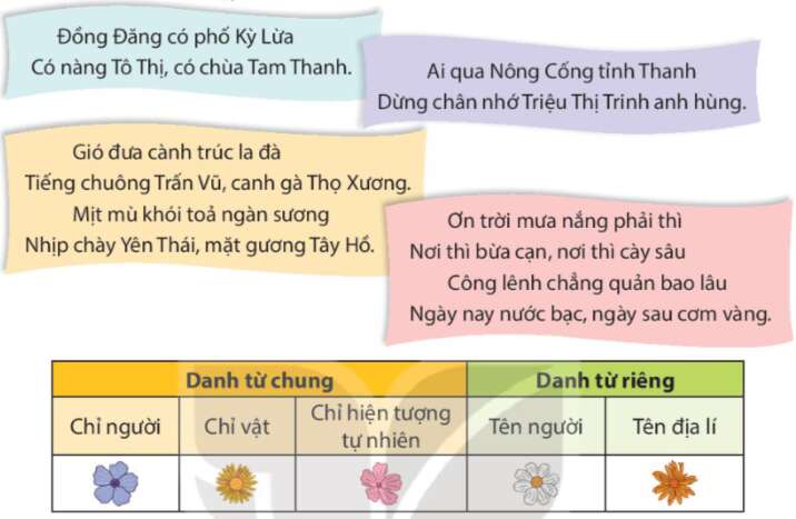 Em đọc kĩ các câu ca dao, tìm các danh từ chung, danh từ riêng và xếp vào nhóm thích hợp.
