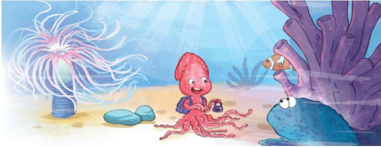 Cá mực tung tăng đi học trong làn nước biển xanh biếc, cái lọ mực kè kè một bên.