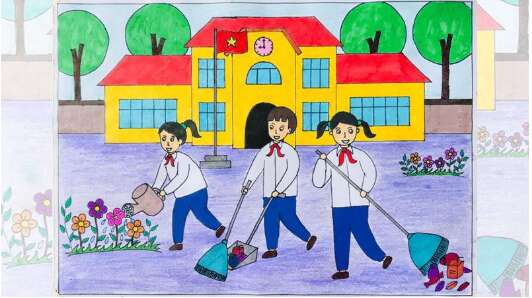 Đây là bức tranh của em. Bức tranh vẽ cảnh các bạn đang vệ sinh sân trường. Bạn thì tưới hoa, bạn thì quét rác. Trong tranh em sử dụng màu vàng là màu tường cho trường học với mái ngói đỏ tươi. Xa xa, là hàng cây xanh. Sân trường em tô màu xám. Những hàng hoa tươi thắm thì sặc sỡ sắc màu, nào là màu hồng, màu cam, màu tím…. Đồng phục của các bạn học sinh là áo trắng, quần xanh.