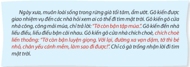 Ngày xưa, muôn loài sống trong rừng già tối tăm, ẩm ướt. Gõ kiến được giao nhiệm vụ đến các nhà hỏi xem ai có thể đi tìm mặt trời. Gõ kiến gõ cửa nhà công, công mải múa. Gõ cửa nhà liều điều, liều điều bận cãi nhau. Gõ cửa nhà chích choè, chích chòe mải hót… Chỉ có gà trống nhận lời đi tìm mặt trời.
