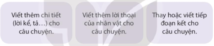 – Có nhiều cách viết đoạn văn tưởng tượng như: bổ sung chi tiết (lời kể, tả,…), bổ sung lời thoại của nhân vật, thay hoặc viết tiếp đoạn kết,…