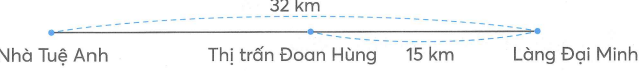 Bài 8. Thị trấn Đoan Hùng và làng Đại Minh cách nhau 15 km. Nhà bạn Tuệ Anh cách làng Đại Minh 32 km (xem hình vẽ). Hỏi nhà bạn Tuệ Anh cách thị trấn Đoan Hùng bao nhiêu ki-lô-mét?