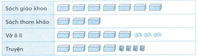 Biểu đồ dưới đây cho biết số sách, vở, truyện của lớp 2A đã quyên góp được để giúp đỡ các bạn vùng bị lũ lụt. Mỗi  là 10 cuốn.