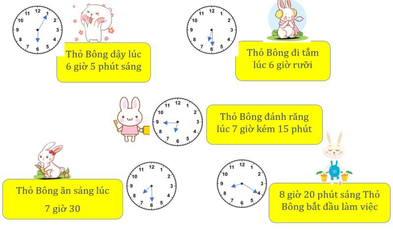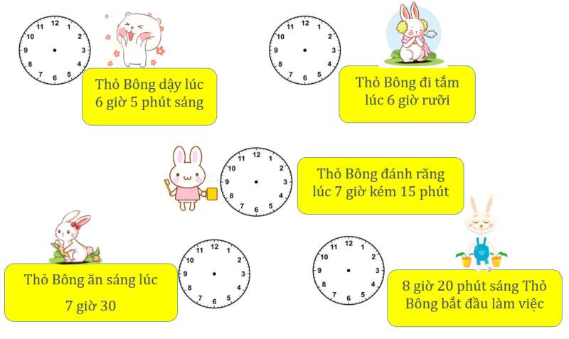 Bài 2. Hãy giúp bạn Thỏ Bông vẽ kim đồng hồ chính xác nhé.
