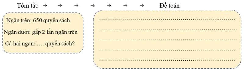 Đề toán: Ngăn trên có 650 quyển sách, số sách ở ngăn dưới gấp 2 lần số sách ở ngăn trên. Hỏi cả hai ngăn có bao nhiêu quyển sách?