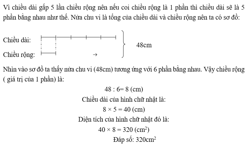 Bài 3 Nửa chu vi của một hình chữ nhật là 48cm, biết chiều dài gấp 5 lần chiều rộng. Tính diện tích hình chữ nhật đó?