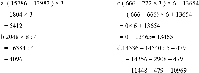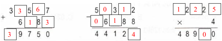 12467 + 329 = 12796           5000 – 35 = 4965            14058 × 4 = 56232           27143 : 3 = 9047 ( dư 2)