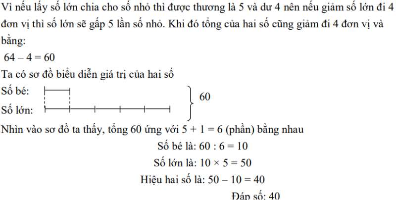 Bài 1 :Tổng của hai số là 64, nếu lấy số lớn chia cho số nhỏ thì được thương là 5 và dư 4. Tìm hiệu của hai số đó.
