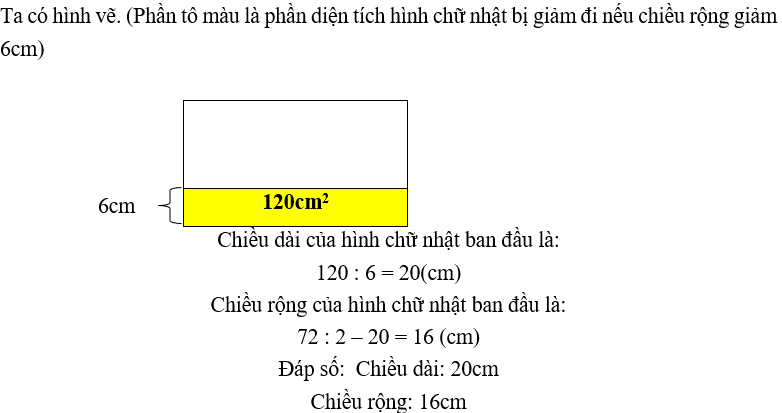 Bài 4. Một hình chữ nhật có chu vi 72cm. Nếu giảm chiều rộng đi 6cm và giữ nguyên chiều dài thì diện tích giảm đi 120cm2.