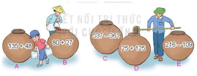 Giải Toán lớp 3 Tập 1 trang 10 Bài 3: a) Những chum nào ghi phép tính có kết quả lớn hơn 150 ?
