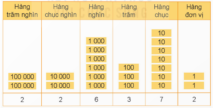 Số gồm: 2 trăm nghìn, 2 chục nghìn, 6 nghìn, 3 trăm, 7 chục và 2 đơn vị