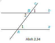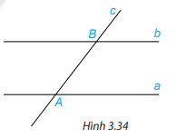 HĐ 2 trang 52 Toán lớp 7: Vẽ hai đường thẳng song song a,b. Kẻ đường thẳng c căt đường thẳng a tại A và cắt đường thẳng b tại B. Trên Hình 3.34: