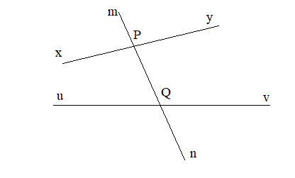 Câu hỏi 1 trang 46 Toán lớp 7: Cho đường thẳng mn cắt đường thẳng xy và uv lần lượt tại hai điểm P và Q (H.3.17). Em hãy kể tên:
