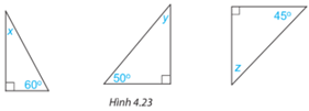 Bài 4.7 trang 69 Toán lớp 7: Các số đo x, y, z trong mỗi tam giác vuông dưới đây bằng bao nhiêu độ?