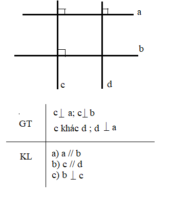 Bài 3.30 trang 58 Toán lớp 7: Cho hai đường thẳng phân biệt a, b cùng vuông góc với đường thẳng c; d là một đường thẳng khác c và d vuông góc với a. Chứng minh rằng: