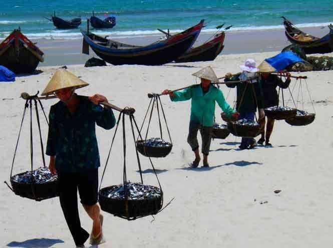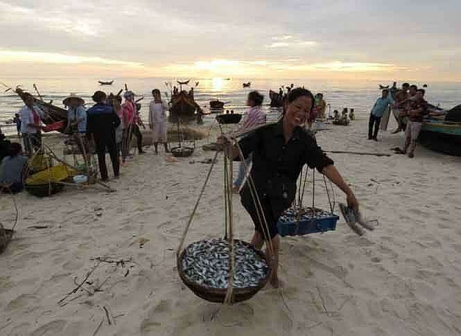 Khi trời hãy còn tờ mờ sáng, mặt trời chưa thức giấc, một góc bãi biển đã lác đác bóng người. Những người phụ nữ hiền lành, chất phác bắt đầu công việc ngày mới từ bốn giờ sáng. Họ nhanh nhẹn nhận lấy những thùng cá tôm tươi ngon từ các tàu thuyền vừa ra khơi trở về.
