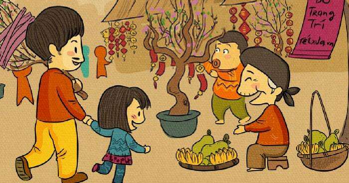 Đi tiến lên chút nữa là quầy bán bánh kẹo. Những hộp mứt, hộp kẹo, bánh được trang trí với nhiều hình dạng và màu sắc sặc sỡ trông thật bắt mắt. Những thỏi kẹo sôcôla hay những gói bánh trứng càng vì thế mà ngon lành hơn. Những lon bia, chai rượu cũng được tô điểm mới lạ, đẹp hơn mọi ngày. Mẹ tôi vào lựa hai chai rượu một gói bánh về chuẩn bị thắp hương. Bước ra khỏi quầy bánh kẹo, tôi và mẹ đến xem quần áo tại một cửa hàng đối diện. Những tấm thổ cẩm, những tấm vải dệt rực rỗ sắc màu làm tôi hoa cả mắt. Kẻ mua, người bán ồn ào, tấp nập. Mấy cô gái trẻ ướm thử những thứ mình định mua rồi quay ra nhìn nhau cười khúc khích. Mẹ chọn cho tôi và Đạt mỗi đứa một bộ để diện đi chơi Tết. Chen giữa dòng người, hai mẹ con tôi như bị cuốn đi trong những tiếng chào mời tíu tít. Luồn lách mãi mới đến được hàng hoa. Vươn lên tán lá dày, xanh mát là hàng chục bông hồng đua nhau toả hương khoe sắc. Chúng khoác lên mình bộ dạ hội đỏ thắm, cao sang cùng những viên kim cương điểm xuyết cho tà áo rực rỡ. Cạnh đó là những bông cúc gắn liền với mùa thu trong sáng, dịu êm. Những bông hoa vàng tươi, kiêu hãnh chao nghiêng theo làn gió nhẹ khoe những cánh vàng e ấp, mịn màng. Chúng như mời gọi các nàng ong, nàng bướm tụ hội. A, kia rồi! Cây bích đào duyên dáng với hàng ngàn, hàng vạn chồi non, lộc biếc như vô vàn những ánh nến lấp lánh ẩn hiện dưới nắng sớm. Nép sau tà áo xanh mơn mởn, những cánh hoa phơn phớt hồng đầu tiên đã hé nở, chào đón Tết đến. Cạnh đó là nơi bán đèn lồng. Những chiếc đèn lồng đỏ rực rỡ để trang trí nhà cửa, cầu cho mọi người năm mới tốt lành.